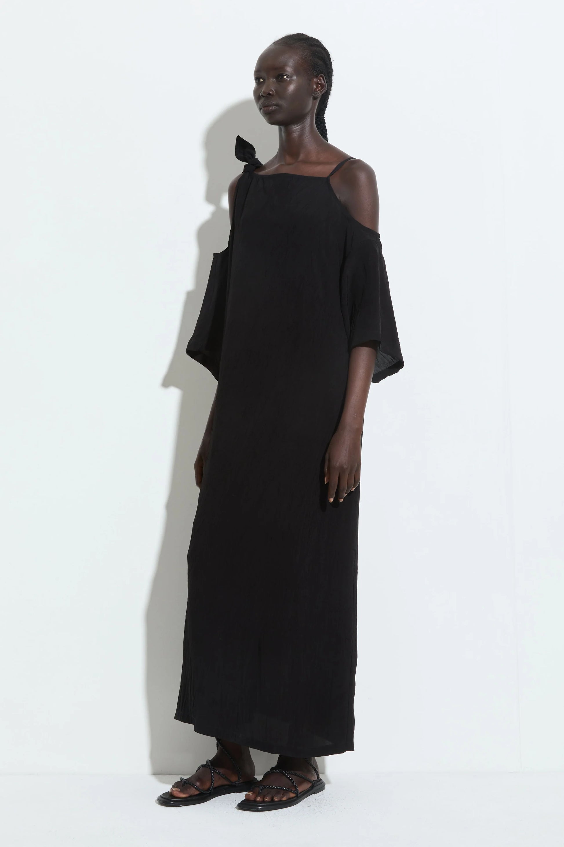 Une silhouette fluide et asymétrique. Cette robe présente des épaules dénudées et des manches mi-longues. Les bretelles nouées lui confèrent une touche sculpturale, tandis que le drapé doux et la brillance délicate du tissu subliment sa longueur et lui confèrent une grande aisance de mouvement.