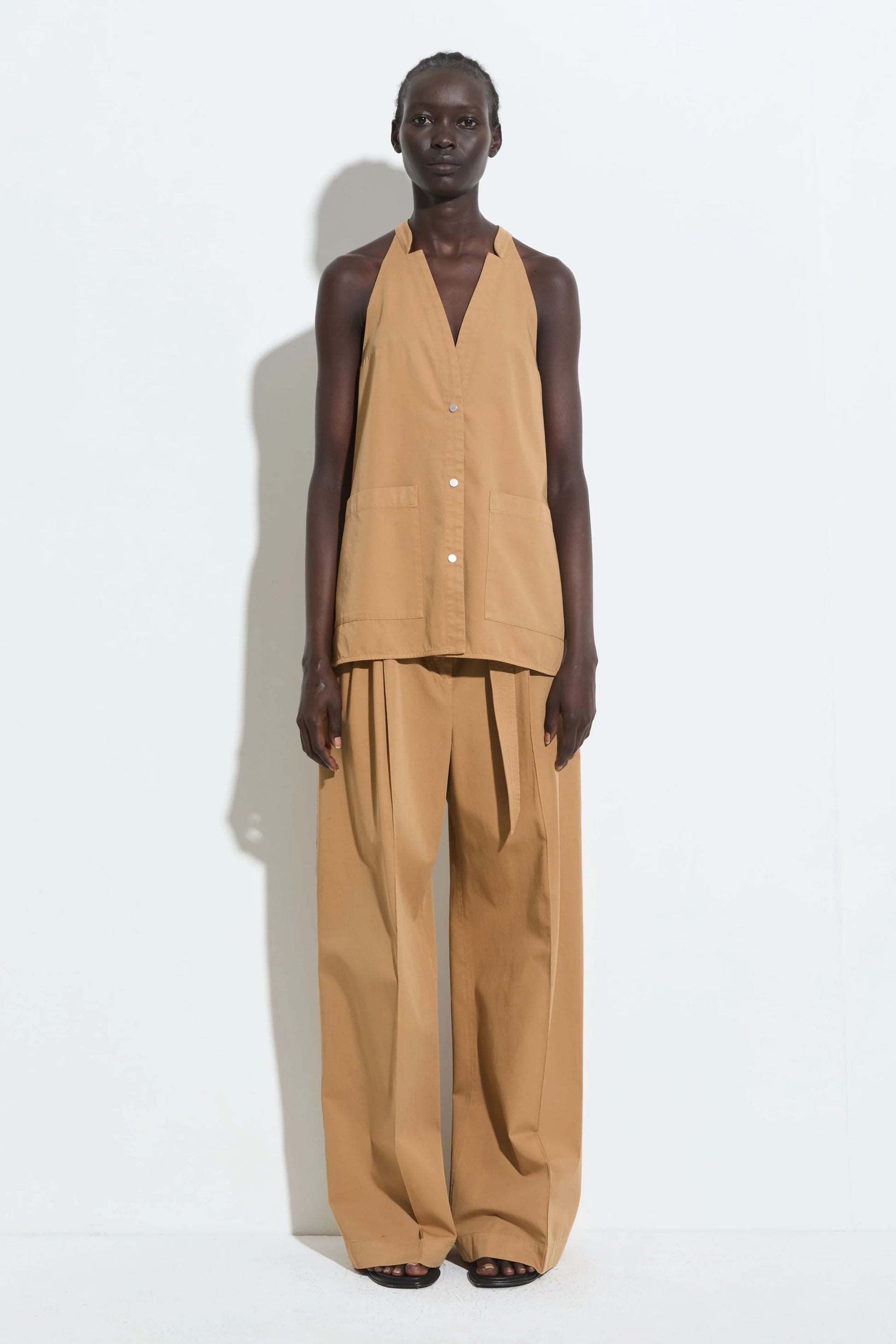 Ce haut dos nu est confectionné dans un tissu léger teint en pièce pour une couleur riche et subtilement variée. Il présente un décolleté en V profond avec un col minimaliste, une fermeture boutonnée sur le devant et deux poches plaquées pour une touche pratique. De légers plis dans le dos créent un effet fluide et drapé, tandis que la silhouette légèrement trapèze offre une allure décontractée et raffinée.