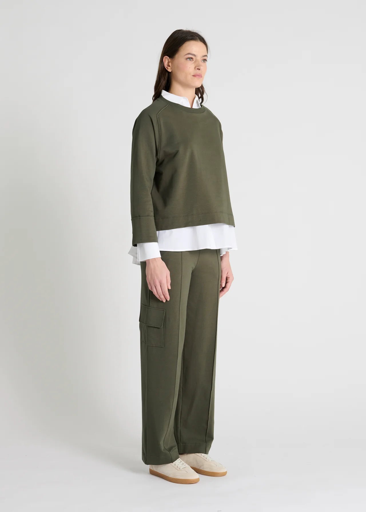 Pantalon molleton doux / coupe large / Ceinture élastiquée avec lien ajustable. Une poche fonctionnelle est placée sur le côté. La base droite de la jambe avec revers donne au pantalon une finition nette.