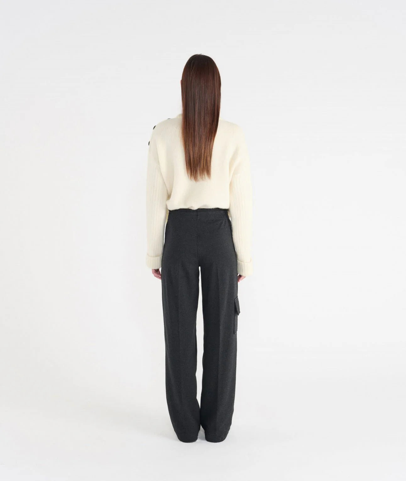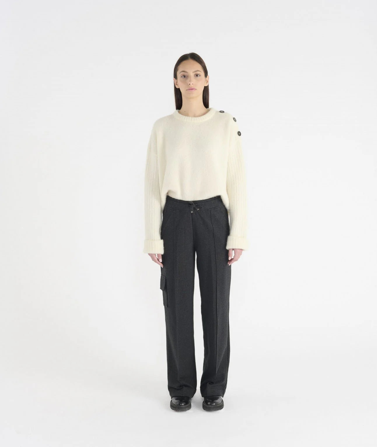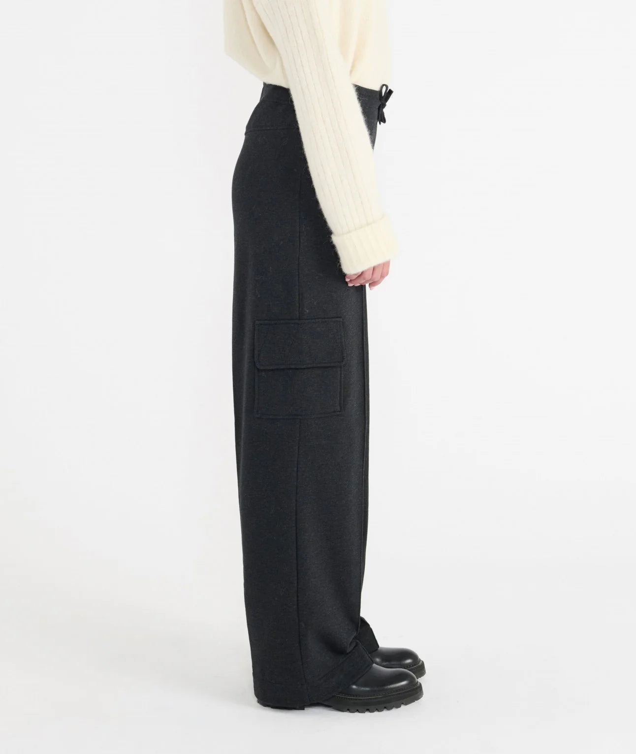 Pantalon molleton doux / coupe large / Ceinture élastiquée avec lien ajustable. Une poche fonctionnelle est placée sur le côté. La base droite de la jambe avec revers donne au pantalon une finition nette.