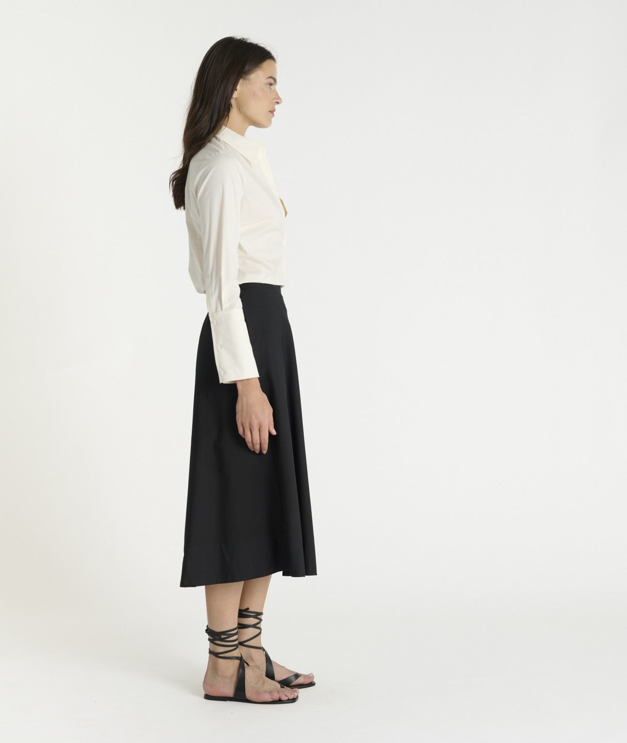 Découvrez Carmen, une jupe élégante en popeline de coton. Munie d'une ceinture élastiquée, elle se ferme par un zip sur le côté. Son volume évasé confère à cette pièce une fluidité gracieuse, créant une silhouette flatteuse et féminine.