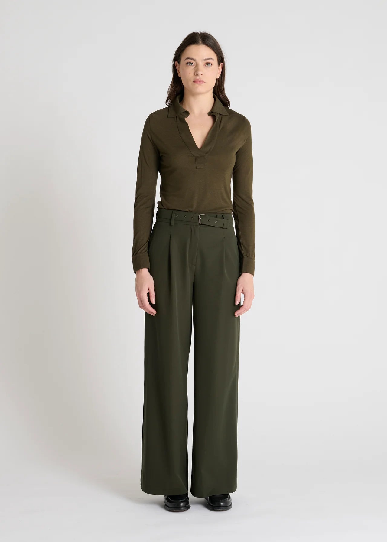 Le col polo structure la silhouette, tandis que les poignets resserrés sont finis par un bouton en nacre naturelle grise, détail subtil et raffiné. La base droite est soulignée par de petites fentes sur les côtés, qui assurent un tombé fluide et dégagent légèrement la hanche. Ce modèle est idéal porté seul, en sous-pull ou glissé sous une veste pour composer un look à la fois chic et confortable.