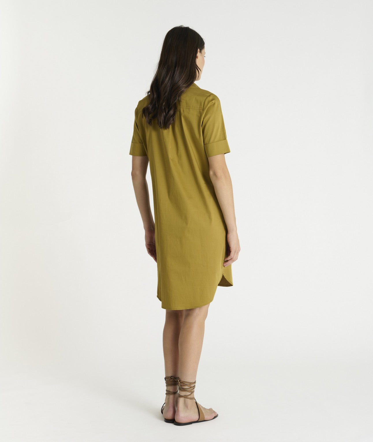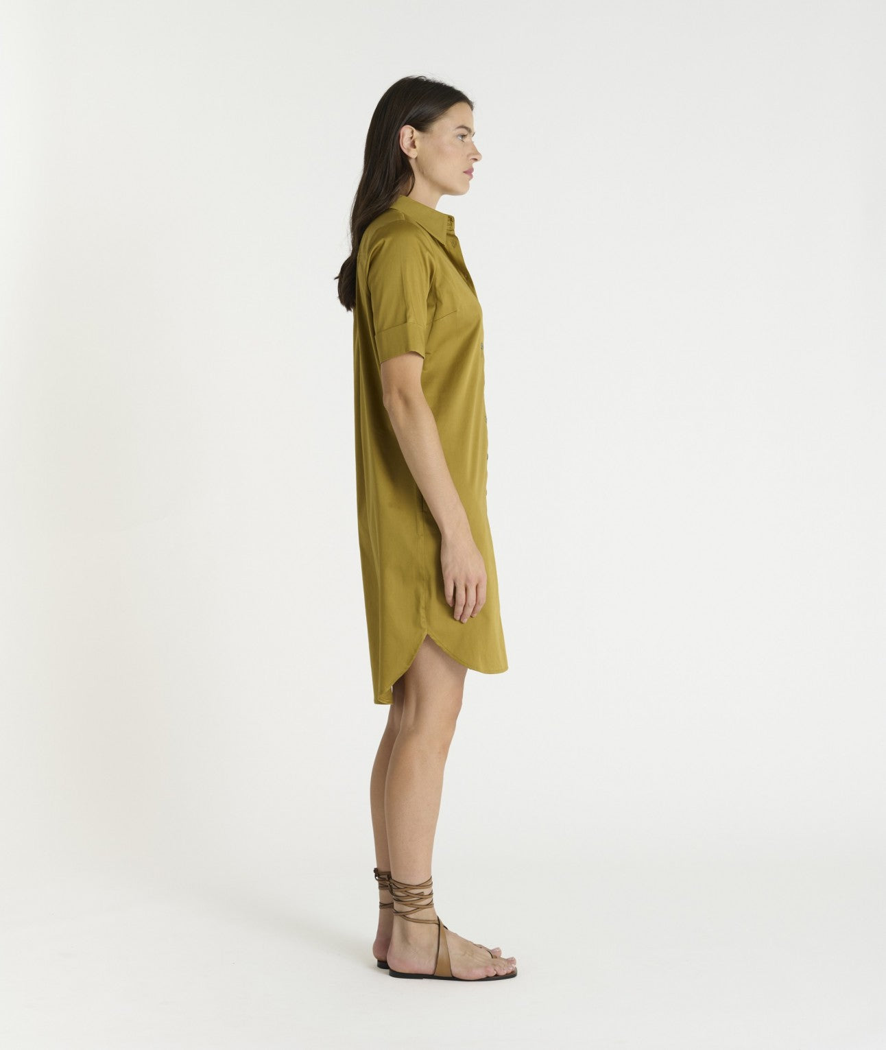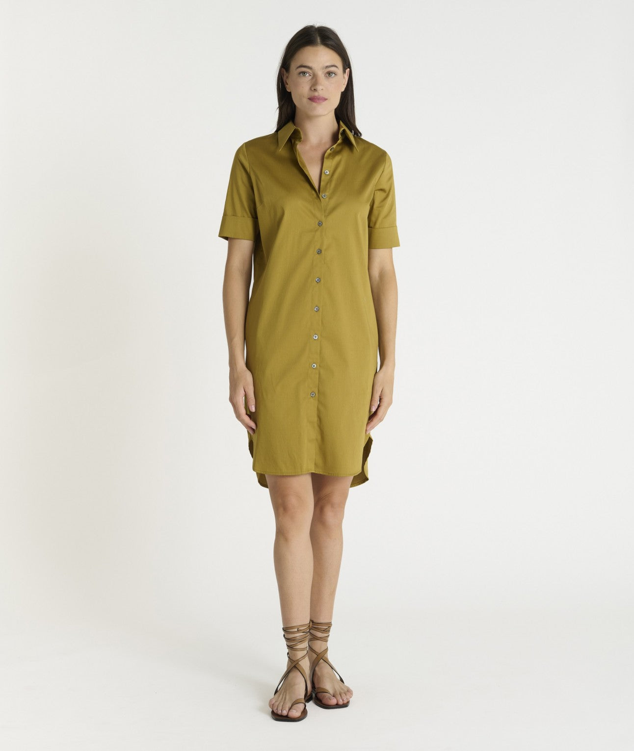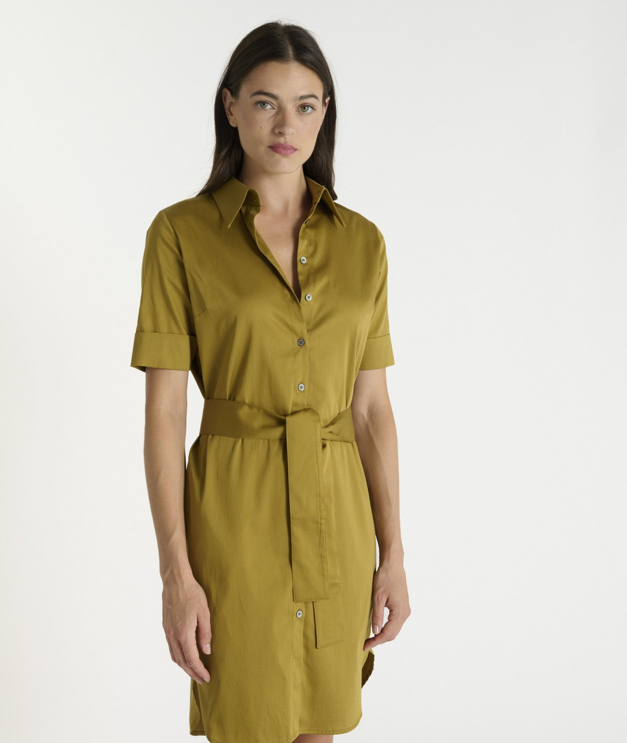 Transformez votre allure avec la robe Trisha, conçue en satin de coton au tombé impeccable. Son col ponctué de douze boutons en nacre naturelle et ses manches courtes à revers insufflent modernité et caractère. Une ceinture amovible affine la taille selon vos envies, offrant une silhouette personnalisée et élégante.