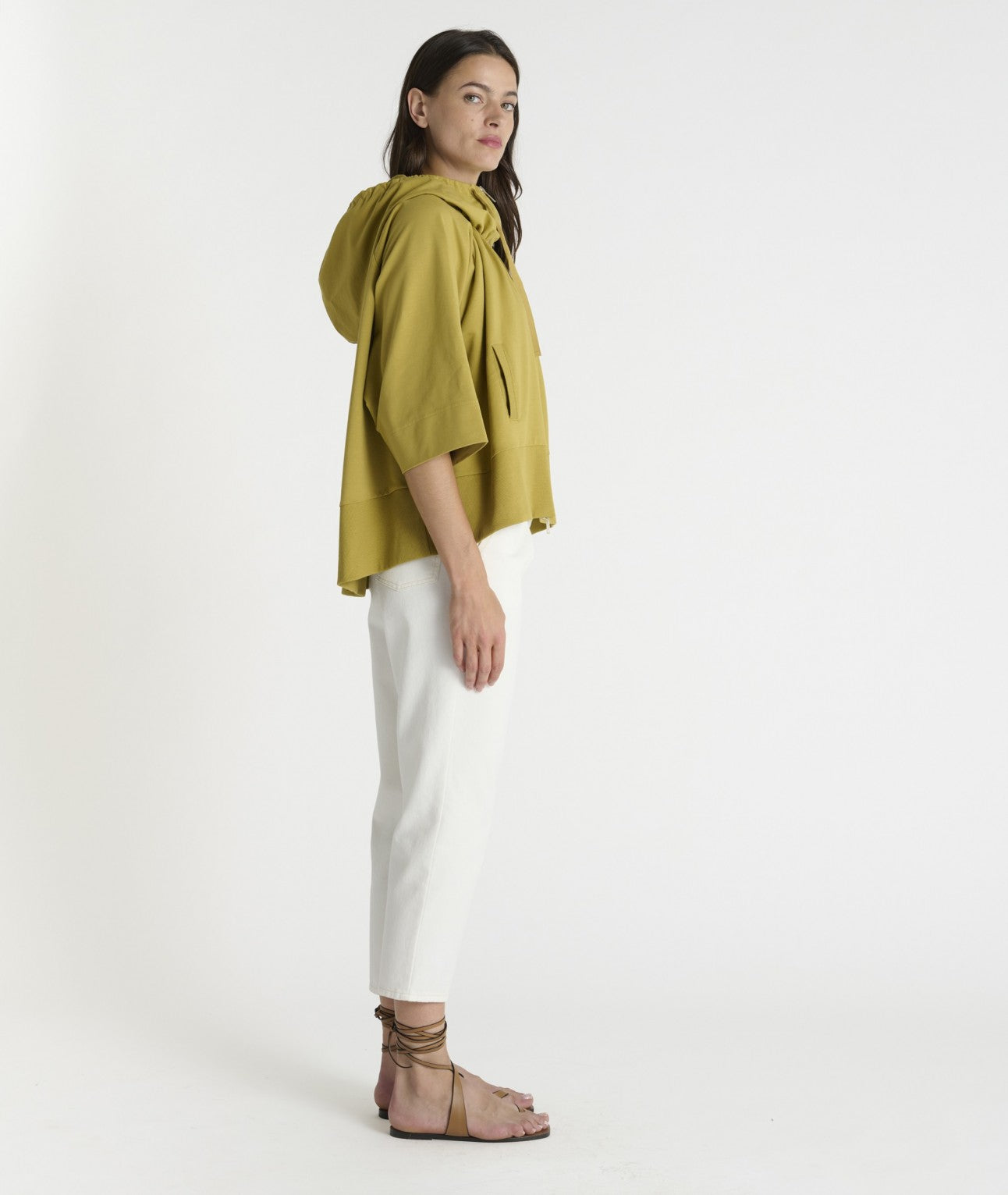 Plongez dans le confort avec la veste Rajan. Son volume évasé et ses manches ¾ dessinent une silhouette décontractée et pleine de caractère. La capuche, ornée de liens en gros-grain siglés Hana San, apporte une touche graphique, tandis que les poches latérales en bord-côte ajoutent une praticité soignée. Les fronces délicates à l'encolure et aux épaules ajoutent une touche féminine et structurée. Fermée par un zip à double curseur, cette pièce s’adapte à toutes vos envies, du look cosy au style affirmé.