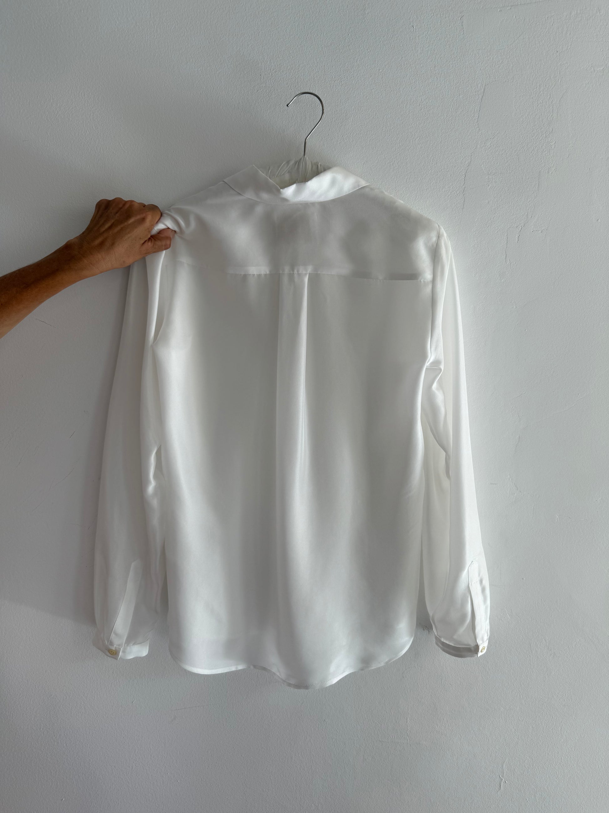 Chemisier à col voile en habotai de soie uni. Alicia a une coupe confortable soulignée par le bas légèrement arrondi et les délicats poignets avec bande.