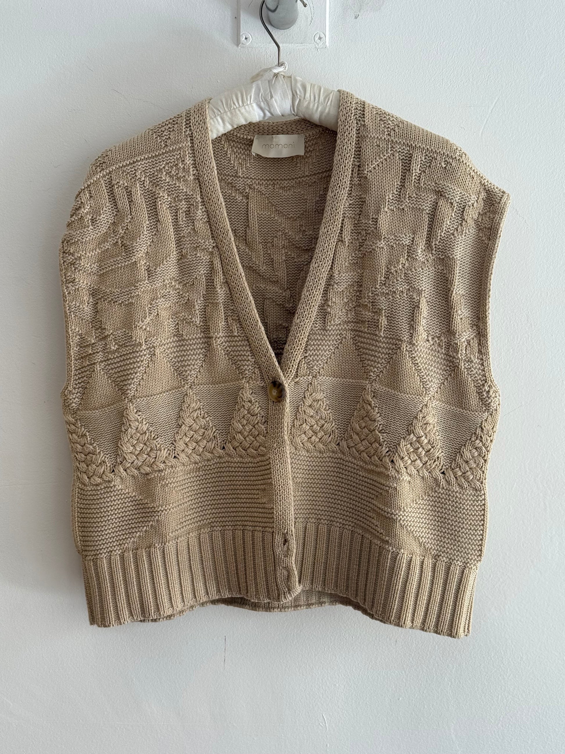 Gilet en tricot coton sans bouton mais avec ceinture en coton, réalisé avec un mélange de points vanisés pour créer un effet tridimensionnel.