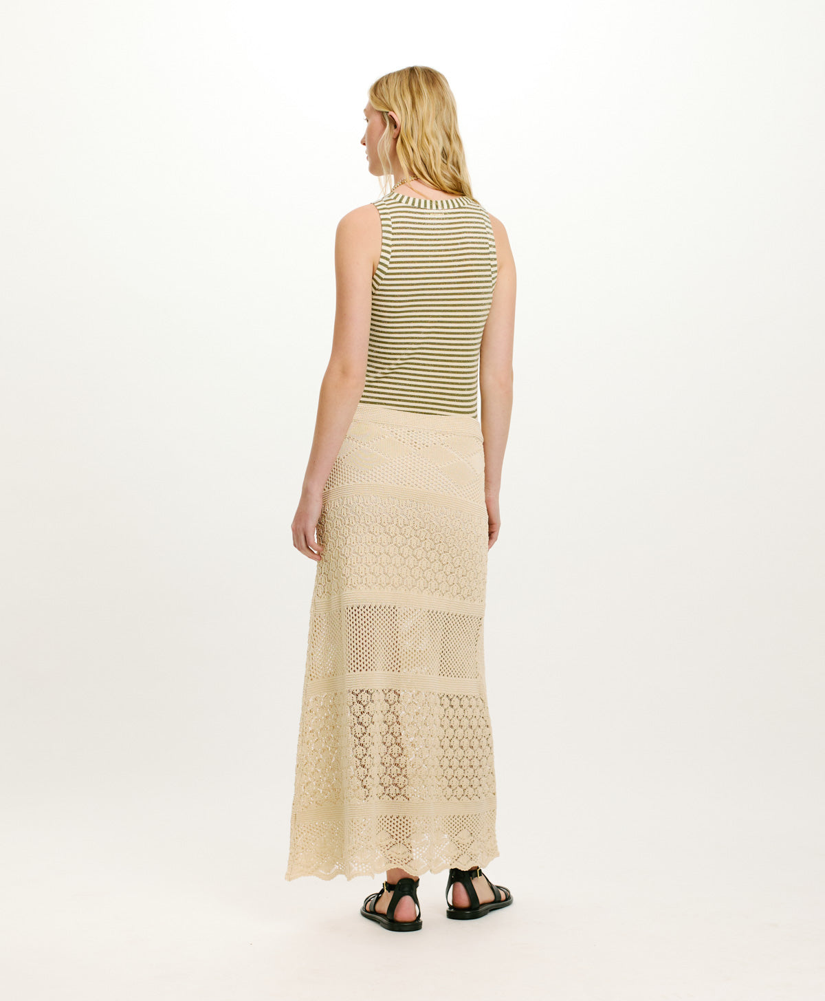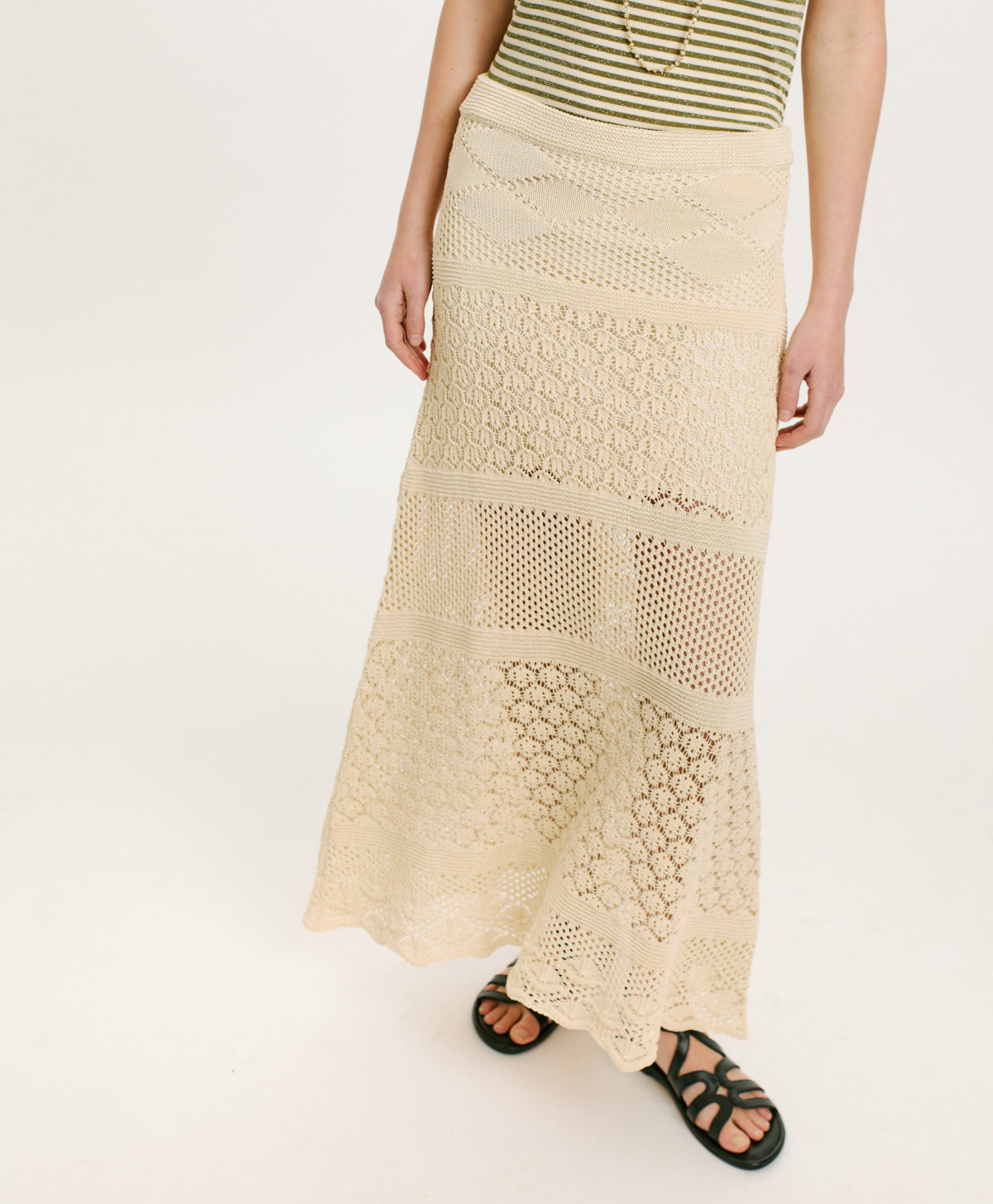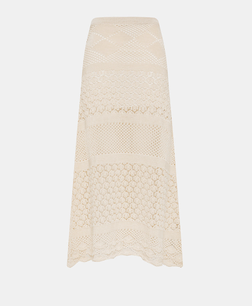 Jupe en tricot réalisé en fil de coton avec un effet spécial de dentelle ajourée et bord ondulé dans le bas. La jupe est légèrement évasée dans le bas. Jupe avec élastique et doublée. Made in Italy