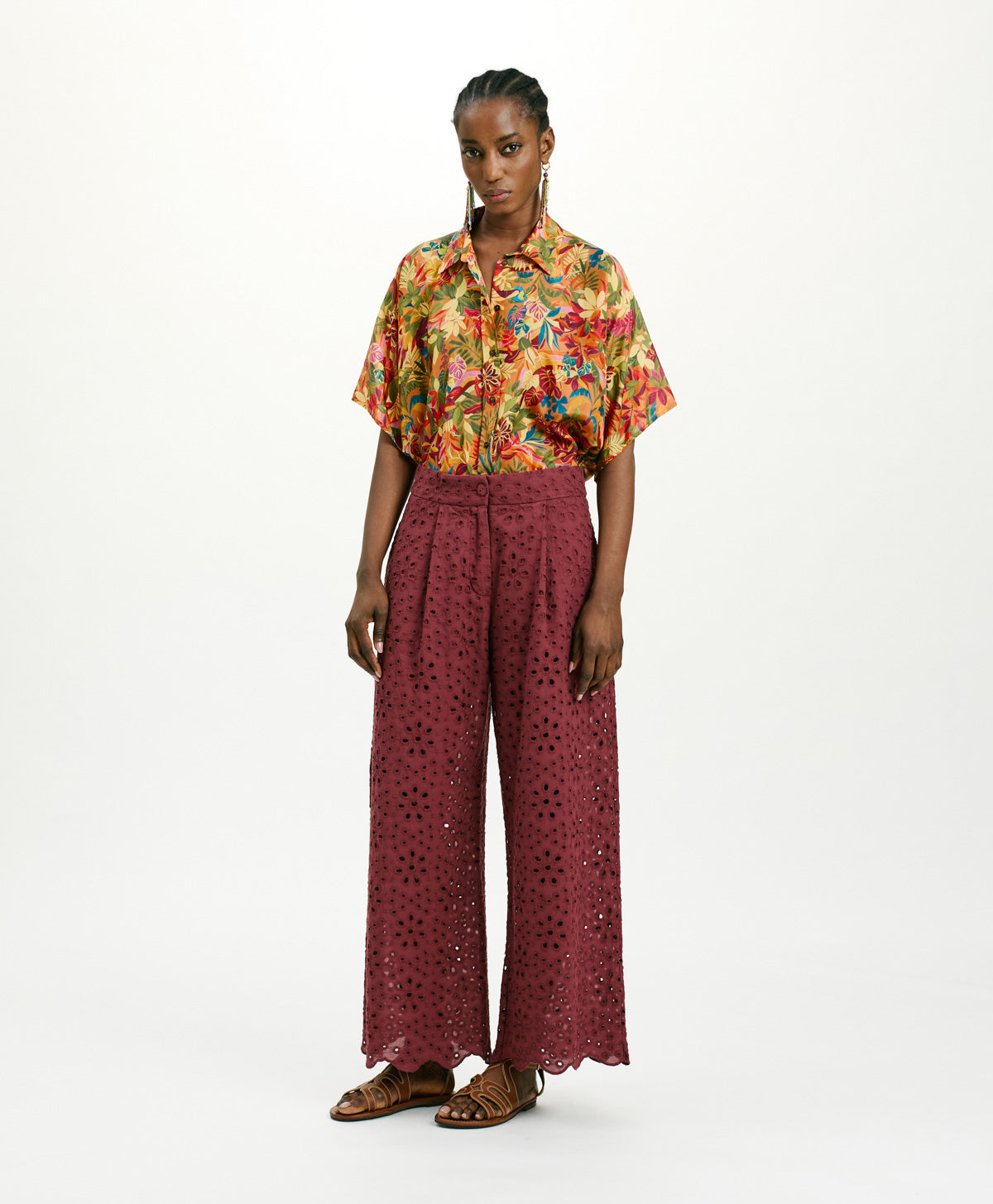 Pantalon long en saint-gall de coton, avec jambe large soulignée par des plis, taille construite, fermeture à bouton et fermeture éclair. Doublure mi-jambe, festonnage sur les bas et poches passepoilées sur les hanches.