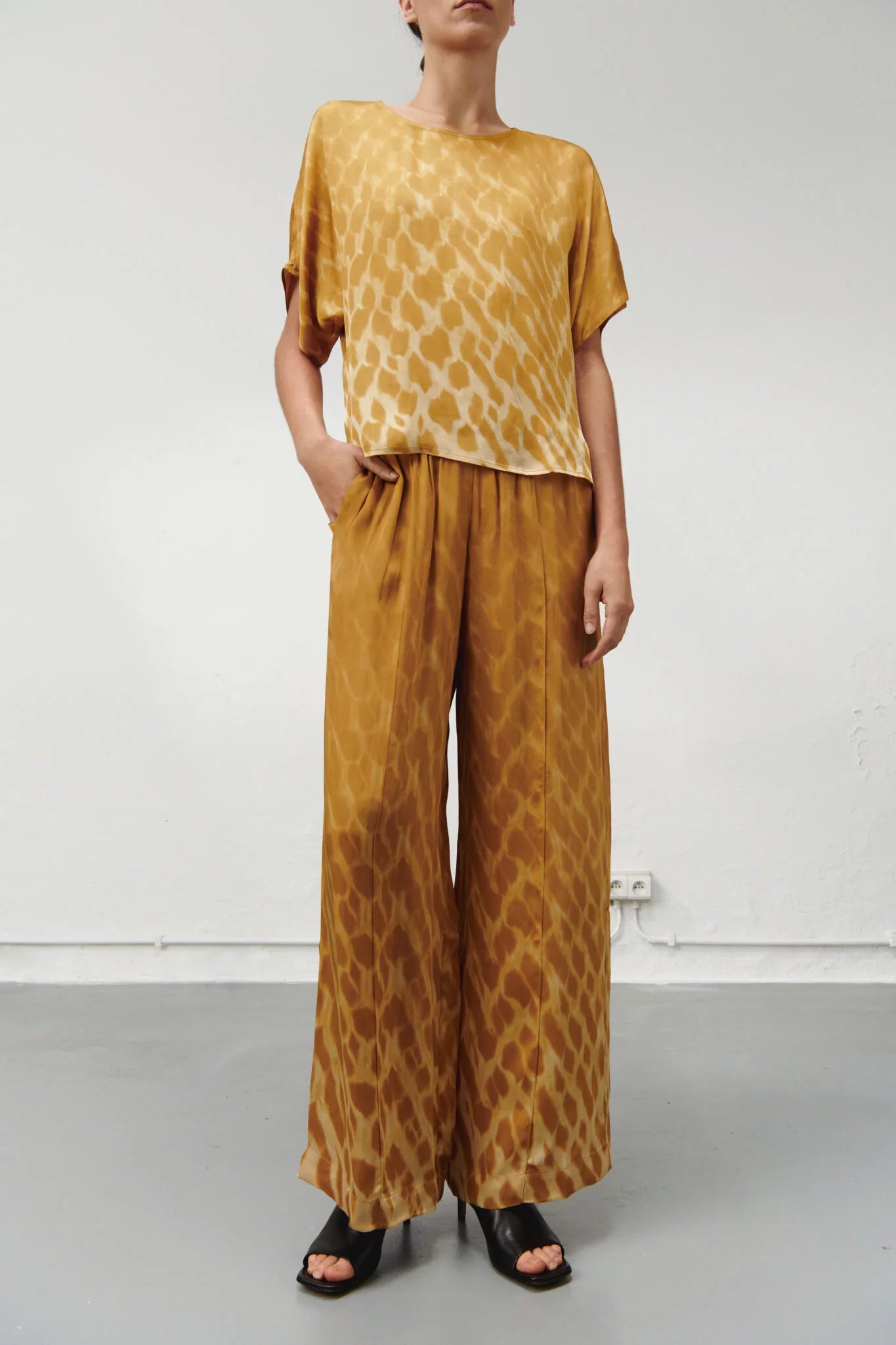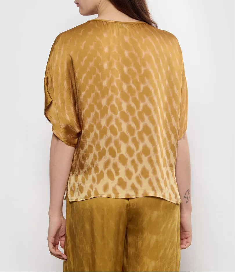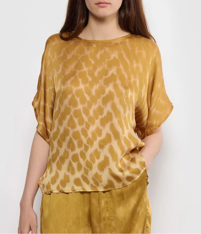 Chemisier élégant à encolure ronde, manches chauve-souris et ourlet droit. Ce haut offre une coupe décontractée et un drapé élégant, alliant confort et style.