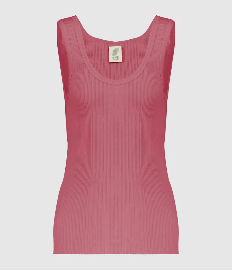 Débardeur en coton côtelé vieux rose. Col rond. Coupe droite. Base droite.